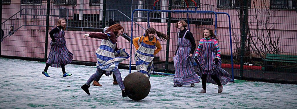Здесь есть свои особенности: во-первых, играют только девочки по пять человек в команде, во-вторых, мячздесь гораздо больше, а в-третьих, его можно прятать под подол длинного сарафана!