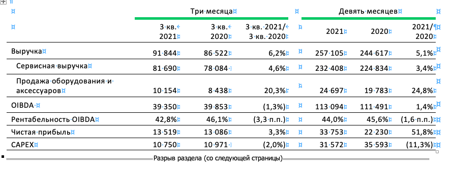 В третьем квартале OIBDA снизилась на 1,3% до 39,4 млрд руб. Рентабельность OIBDA сократилась на 3,3 п.п. до 42,8%. Основные факторы, повлиявшие на рентабельность, — увеличение затрат на рекламу после сокращения в период пандемии, а также на персонал и аренду в связи с восстановлением работы салонов связи и возвращением сотрудников в офисы.