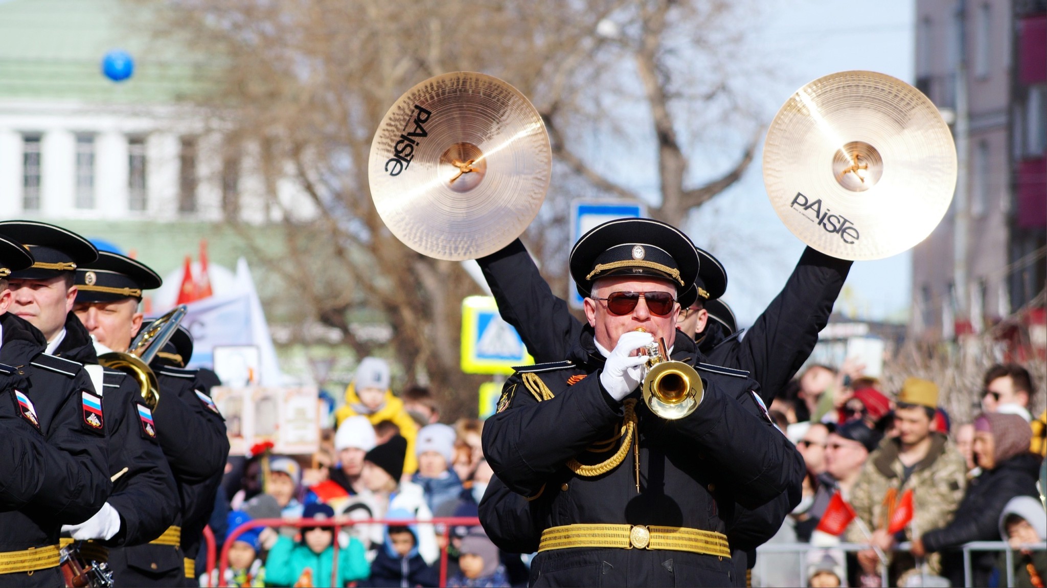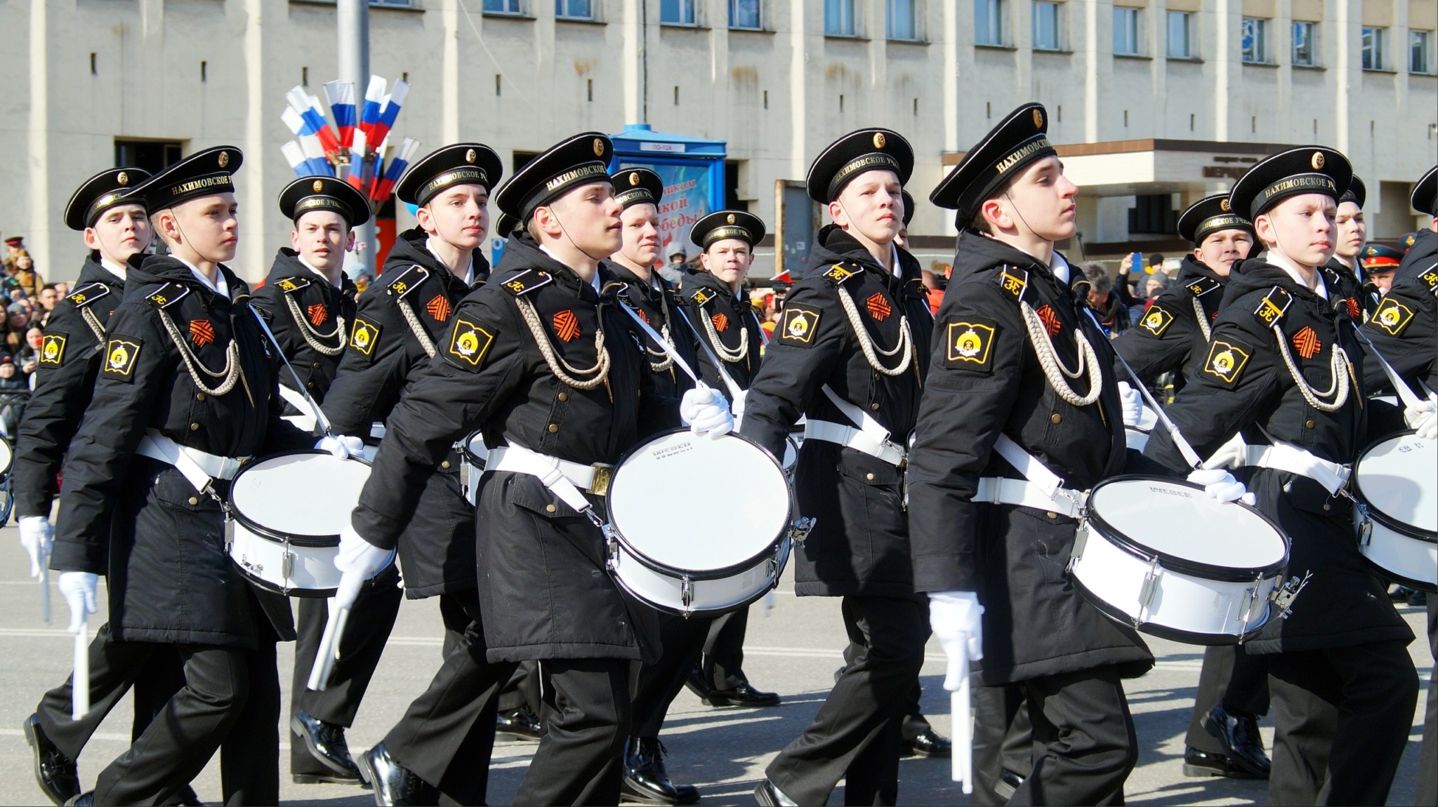 Задавали ритм шествию юные барабанщики — воспитанники Нахимовского военно-морского училища в Мурманске.
